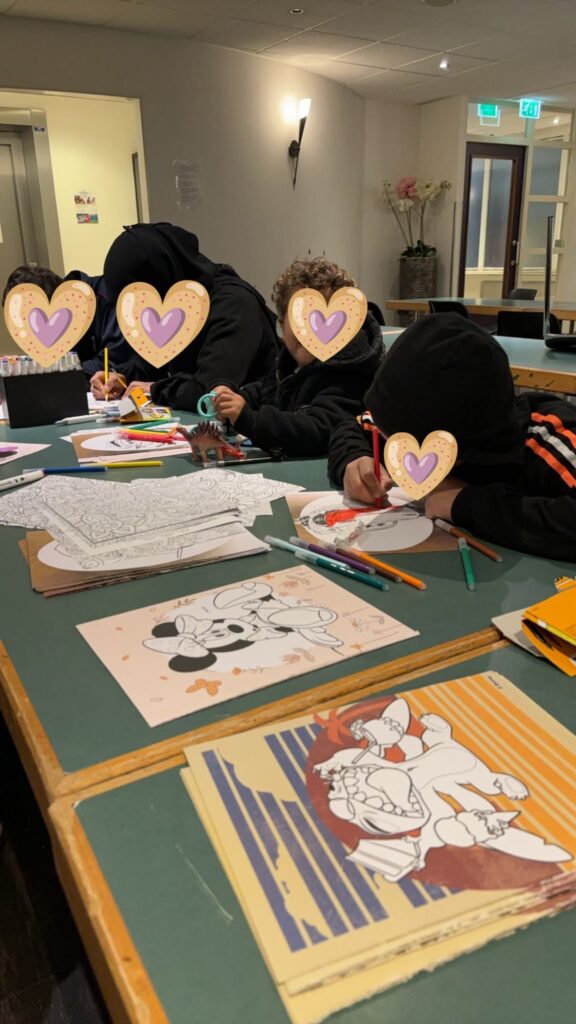 Naast op onze vaste locatie verzorgen wij ook de kunstclub op een noodlocatie van het COA, waar gezinnen verblijven. De noodlocatie is een hotel waar er weinig te doen is voor de kinderen, die daar met hun ouders wonen. In totaal zijn er zo’n 50 kinderen van alle leeftijden. Enorm leuk op deze locatie is dat veel moeders van de kleinere kinderen vaak aanschuiven.